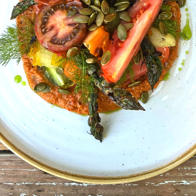 Romesco is a rich spanish sauce using charred peppers and tomatoes. Today we are going to use coal baked peppers to supercharge that rich smoky flavour, giving us really nice complex layers in the sauce. Traditionally served with fish, quite frankly it’s perfect with anything that comes off the grill – this season we’re pairing it with lightly charred heritage tomatoes and the best of British Asparagus, topped with fermented garlic honey pumpkin seeds.