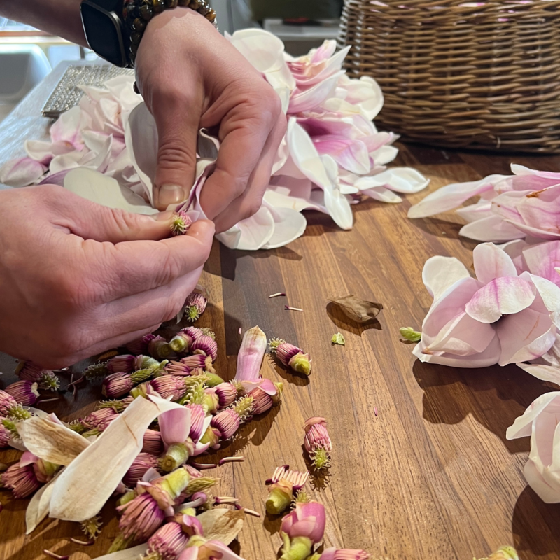 One important note when foraging magnolia petals: be sure to avoid the white, bitter base of the petal. This part can cause an upset stomach and should be removed before using the petals in your cooking.