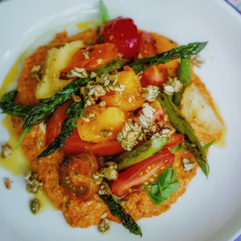 Romesco is a rich spanish sauce using charred peppers and tomatoes. Today we are going to use coal baked peppers to supercharge that rich smoky flavour, giving us really nice complex layers in the sauce. Traditionally served with fish, quite frankly it’s perfect with anything that comes off the grill – this season we’re pairing it with lightly charred heritage tomatoes and the best of British Asparagus, topped with fermented garlic honey pumpkin seeds.