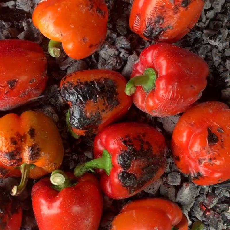 Once completely charred place into a bowl and cover with a tea towel to steam. As the peppers steam the flesh will shrink away from the skin making it easier to peel.