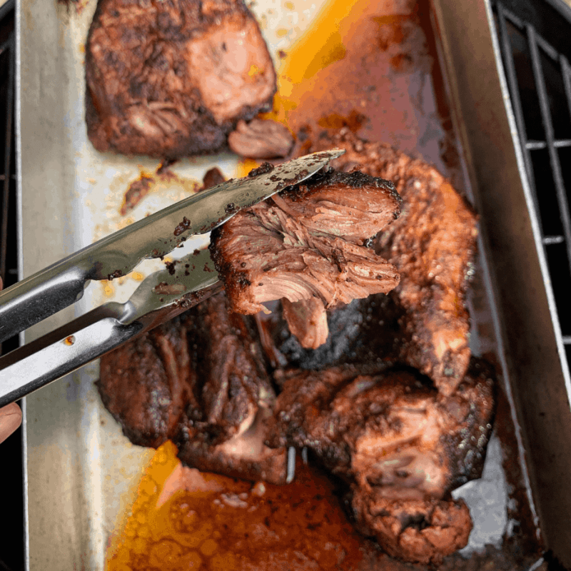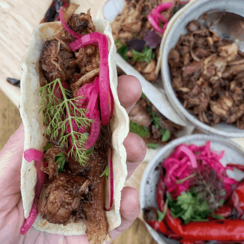 Once the pigs cheeks are cooked to perfection, they can be teased into chunks. These smoked pigs cheeks are a great foundation to so many dishes! Tucked into a taco, eaten on toast with pickles and chutney or crisped up and scattered over a salad. You could even set them in the fridge with a little of the cooking liquor and then cut them into bite sized pieces, crumb them and deep fry for the most incredible nuggets!