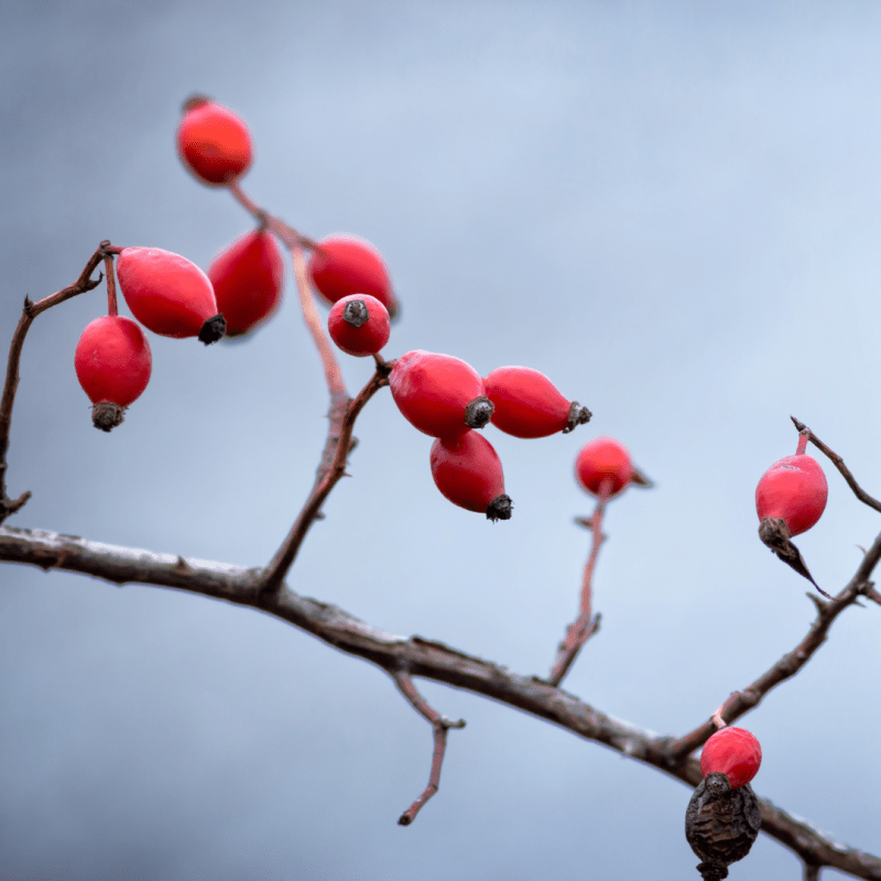 Once the petals have fallen at the end of summer, a bright red berry appears – this is the rose hip – traditionally the most utilised part of the plant.