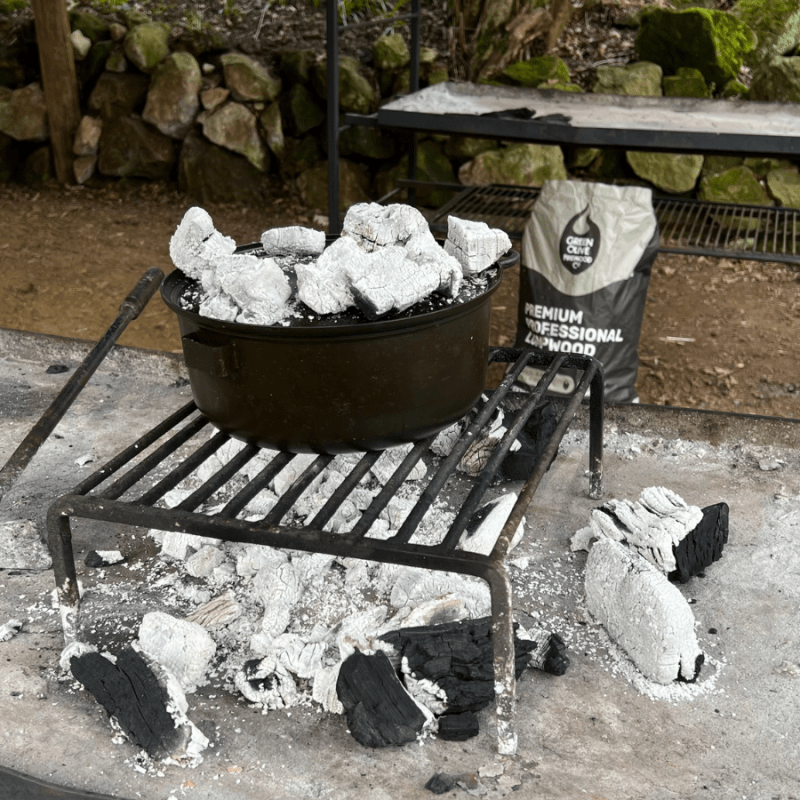 Preheat your Big Green Egg to 200℃ with the Conveggtor plate placed inside, legs facing up. Alternatively light a small pile of Green Olive Firewood Premium Professional charcoal in your fire pit.