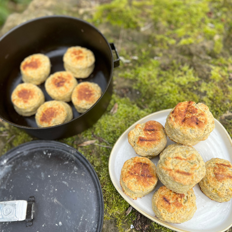 Place them in batches either on the grill of the Big Green Egg lined with a round of greaseproof paper to stop the scones trying to squeeze through the grill bars. Or rake out the pile of charcoal into a ring, place a medium high grill over the ring of charcoal and place on the Madog dutch oven base onto the grill rack, place six scones inside. Replace the lid of the dutch oven and place a few large lumps of glowing embers on to the lid and allow the scones to bake.