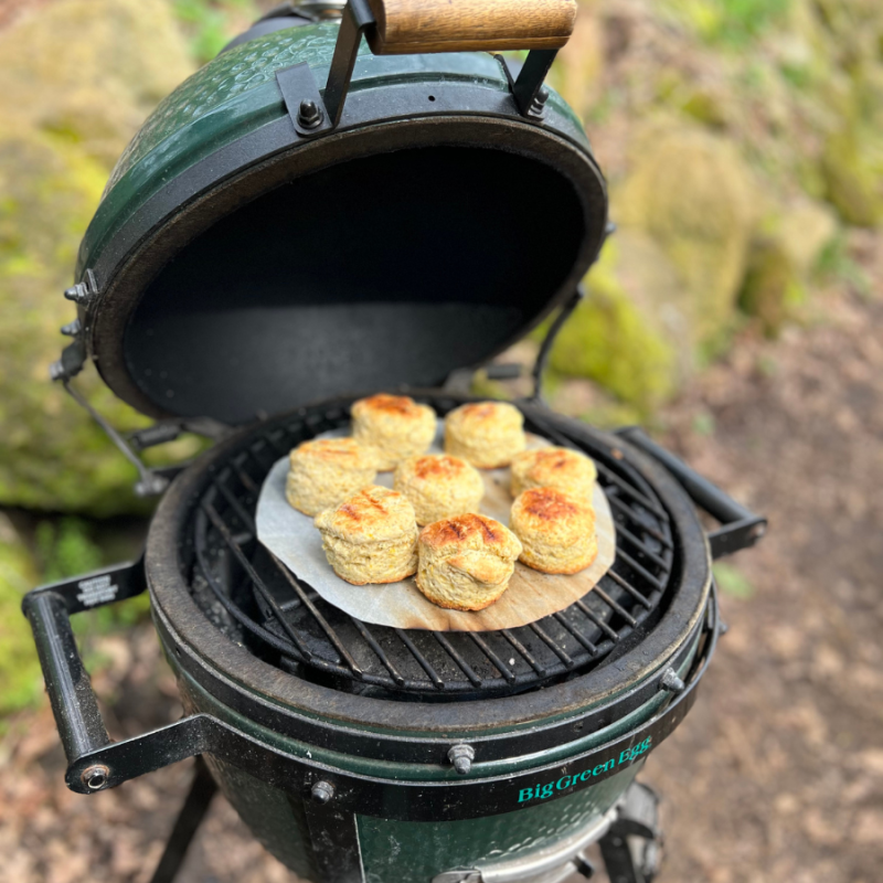 Line the Big Green Egg with a round of greaseproof paper to stop the scones trying to squeeze through the grill bars.
